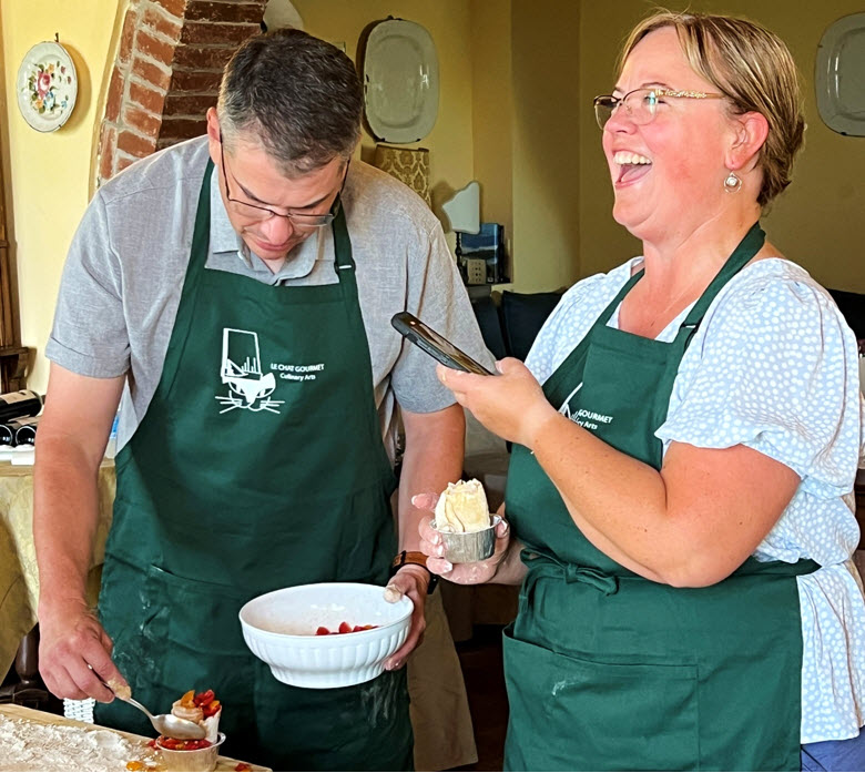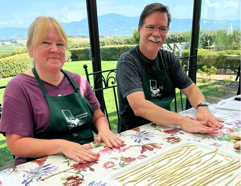 The Tuscany adventure with Chef Vincent exceeded my expectations and I was expecting it to be awesome! Not only did we have wonderful food in a relaxing learning environment, but we explored much more of the Tuscany countryside than I thought we would. We experienced multiple small mountain towns and had time to explore churches, museums, forts and shops. We learned about the amazing history of Tuscany, wandered olive groves and vineyards, and had several wine tastings. The week was well organized with a nice pace and the lodging accommodations were superb. Thank you Le Chat Gourmet! – Leslie Hoover, Tuscany 2017