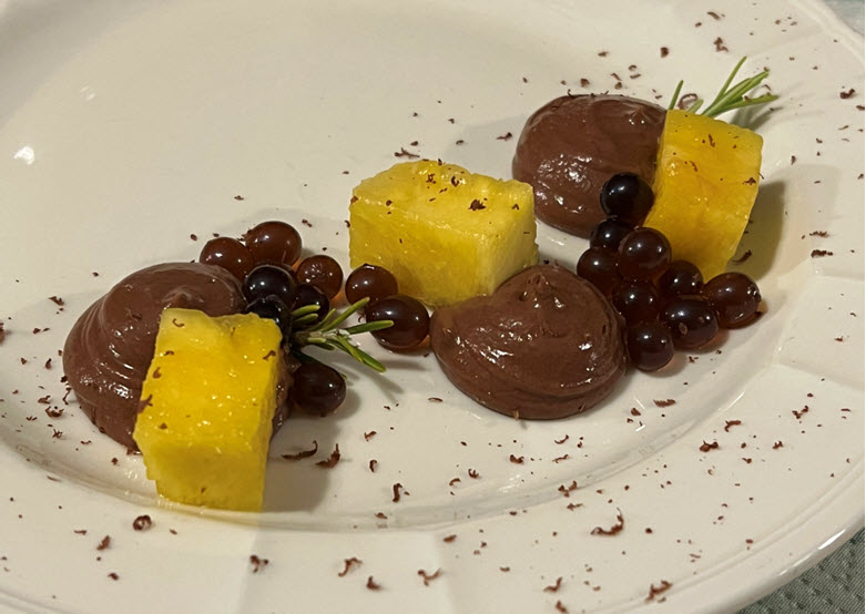 Nutella Mousse, Rosemary Macerated Pineapple Batons, Blueberry Pearls